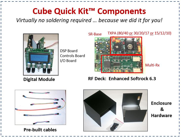 2) RF Deck -- Consists of the Enhanced "Softrock 6.3" modules that we've always used (SR-Base Board and the TXPA transmit power amplifier module (your choice of band set)), as well as the Multi-Rx module that we developed to provide general coverage receive from 3-30 MHz.