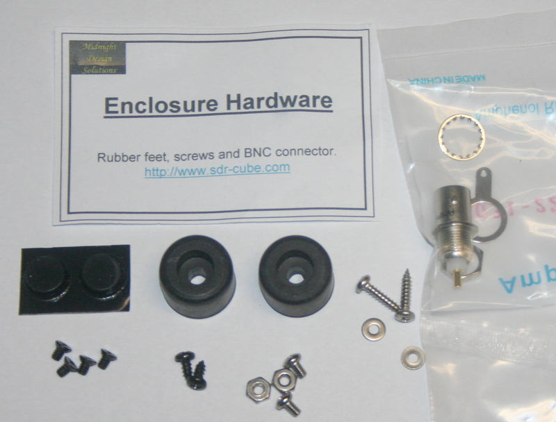 The Enclosure is a 3-part aluminum housing (and related hardware) designed to contain the SDR Cube board set and the mating internal Softrock option. The enclosure is dimensioned approximately 4" x 4" x 4", and comes pre-milled to accommodate the Cube electronics. It has a durable black powder-coated finish with white silkscreened labels on the front and rear panels.