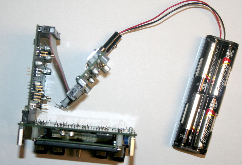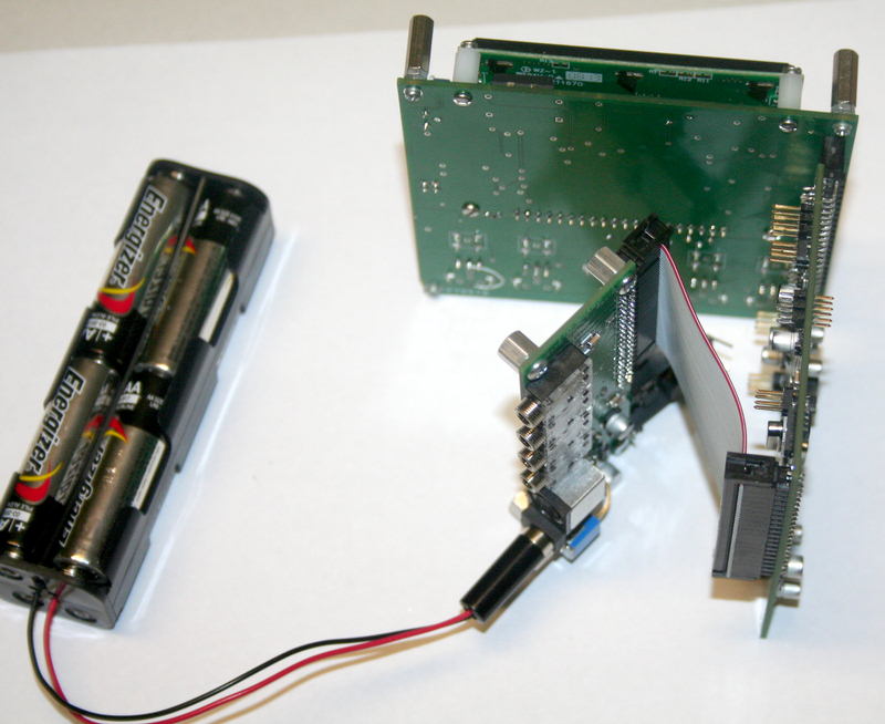 Connect the boards as shown in the photos below, and attach a 12V power source - ideally a battery as shown, or a current limited at 200 ma.